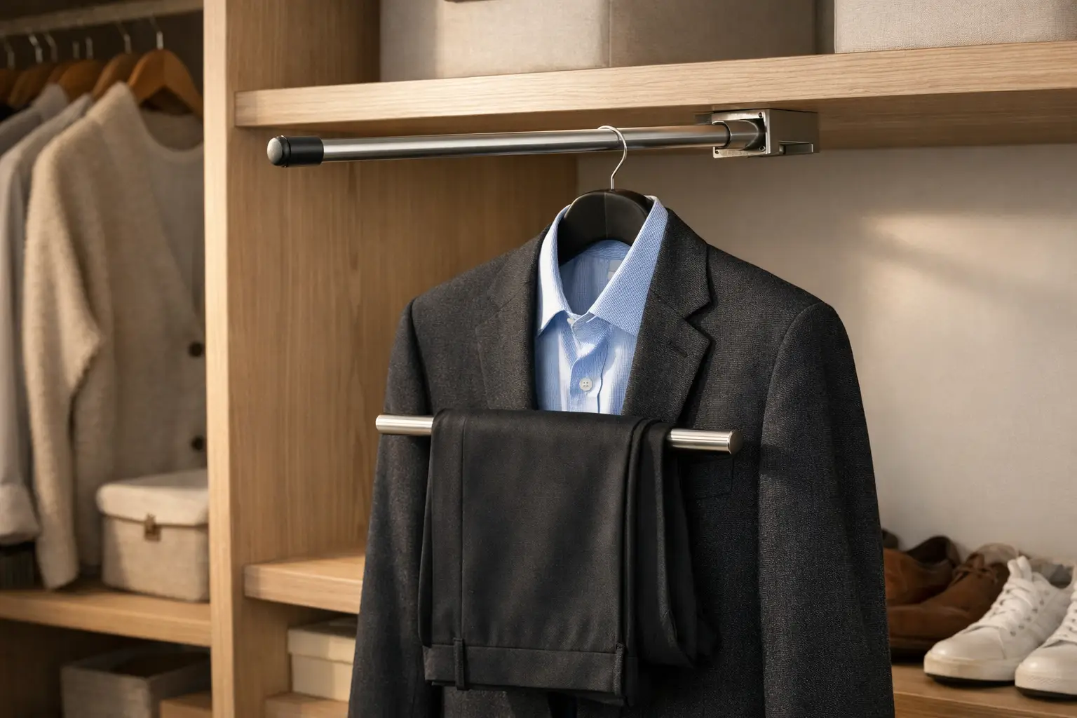 A valet rod is a small but incredibly useful accessory that provides a temporary hanging spot. It typically slides out from a shelf or cabinet side when you need it and disappears when you do not. This is perfect for planning your outfit for the next day or hanging up dry cleaning before you put it away.