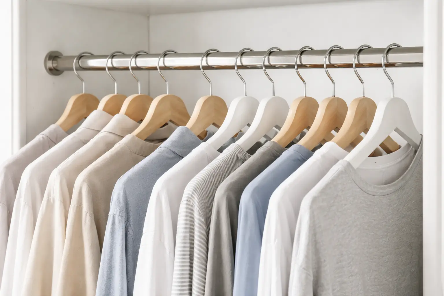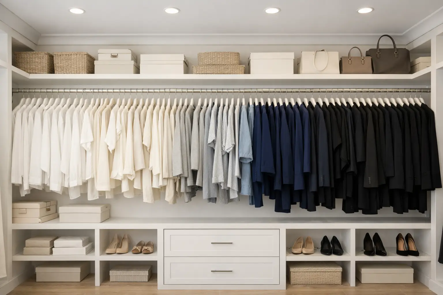 Organize your clothes into color families, but in a functional sense: dark neutrals together, light neutrals together, and bold colors together. Color coding is not just about aesthetics. It actually reduces the time your eyes spend searching, because your brain processes color faster than shape or text. When you know your navy blazer lives in the dark neutrals section, you find it in seconds.