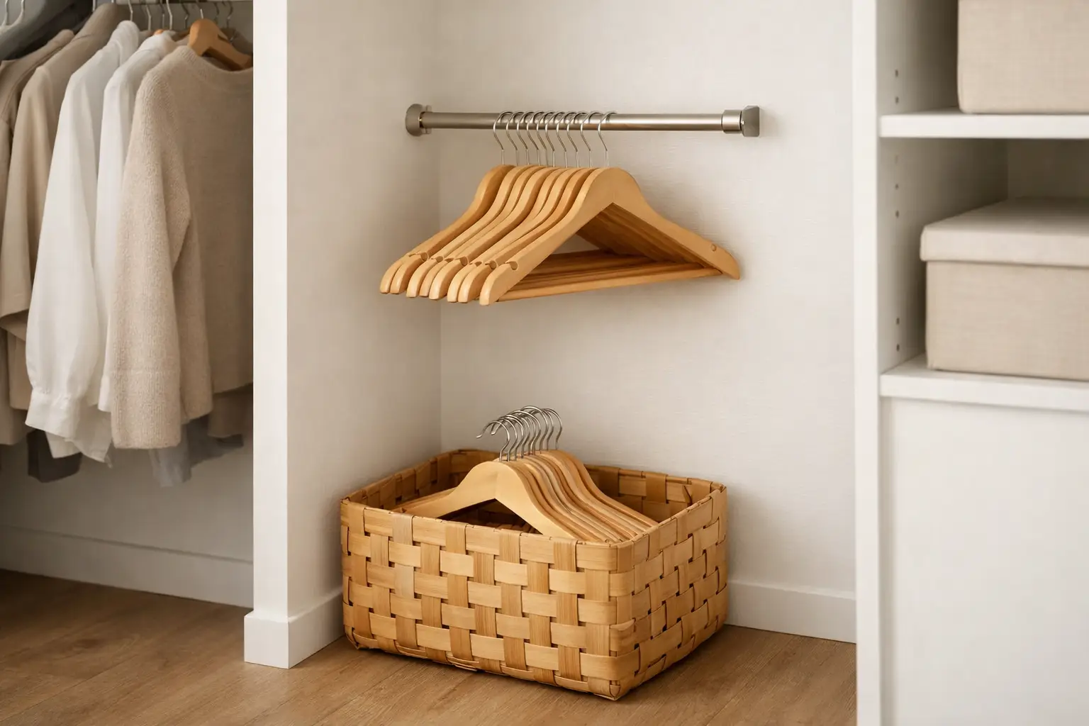 Designate a place for unused hangers instead of letting them be dispersed throughout your closet. Take a special hanging rod or box and dedicate it to unused hangers only. This avoids the cluttered look of empty hangers mixed with clothes and makes putting away clean laundry much easier.