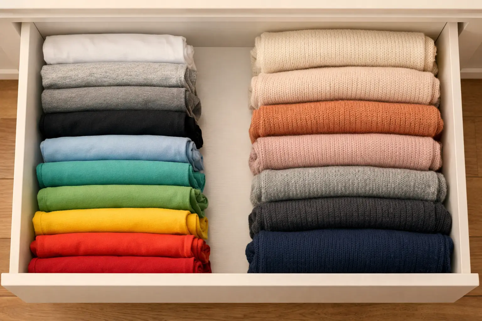 Fold and store clothes so every item in a drawer is visible at a single glance. Use the file fold method for t-shirts and sweaters, standing them upright rather than stacking. This avoids that frustrating problem of reaching the bottom of a stack and finding clothes that have not been worn for ages.