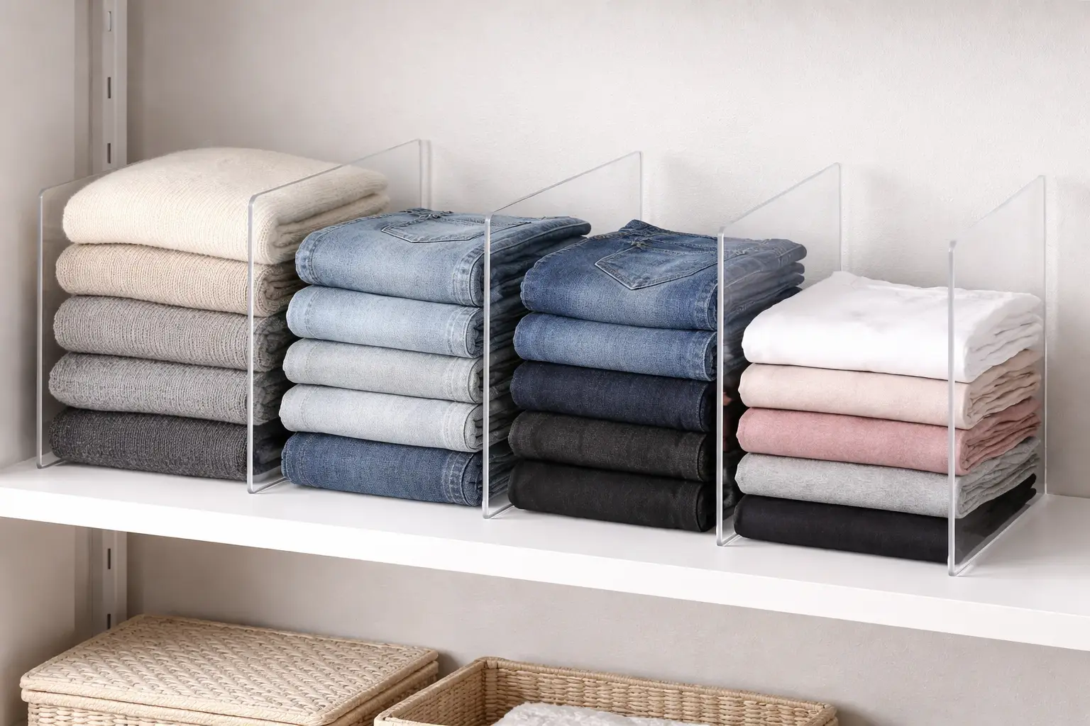 Stacked shelves without dividers always collapse into chaos. A few shelf dividers keep sweaters, jeans, and folded items from toppling into each other. You will never again unfold three shirts just to get to the one at the bottom.