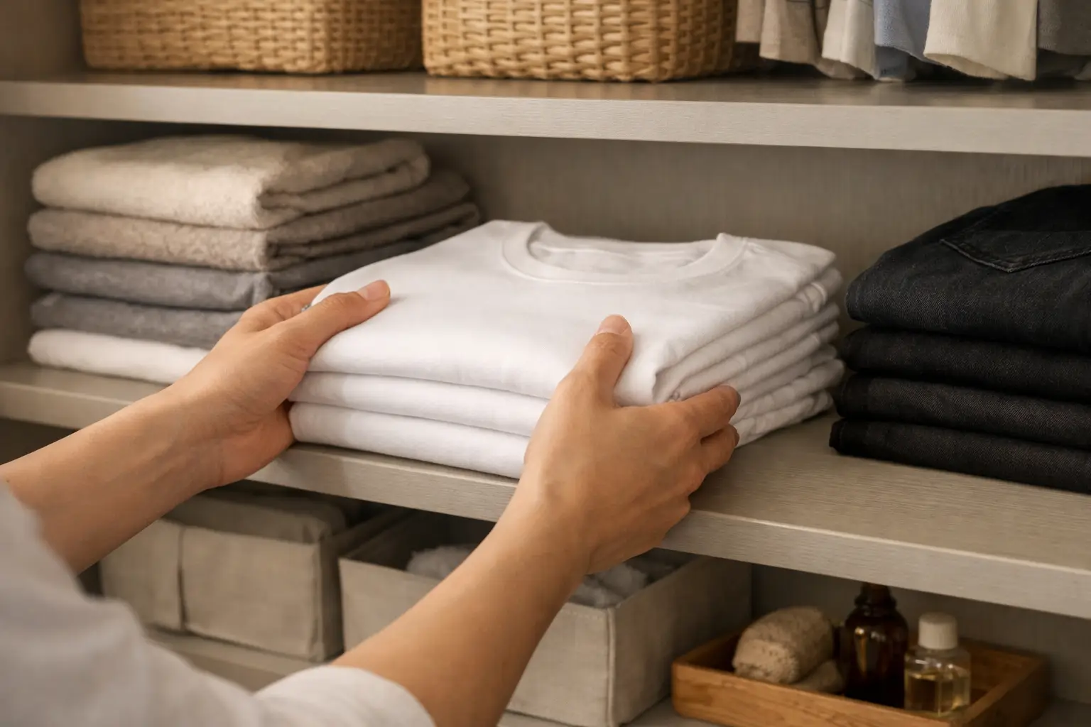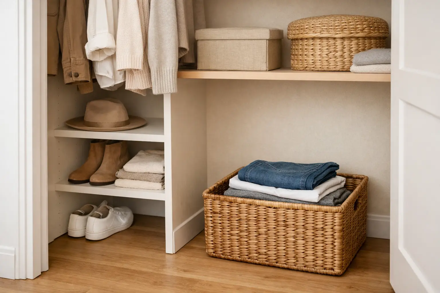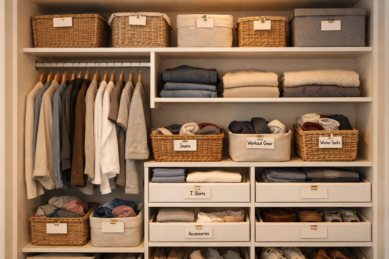 Keep your most-worn pieces front and center. Move your go-to jeans, favorite tees, and everyday shoes to the most accessible spots. Storing seasonal or occasional pieces higher up or toward the back helps clear the way for your daily staples.