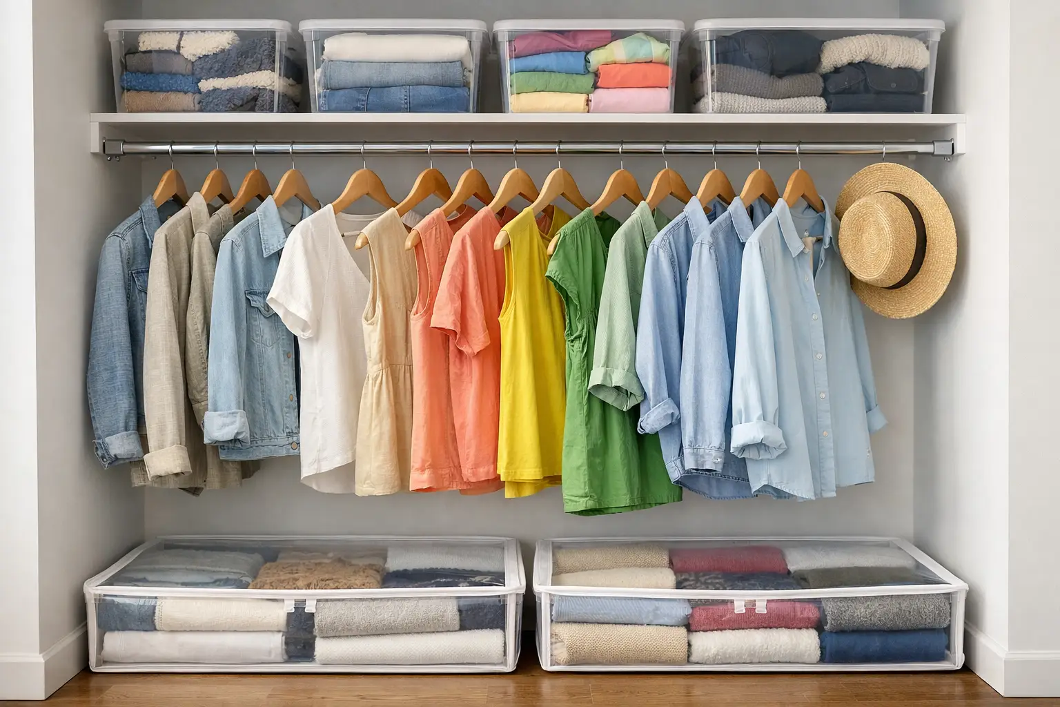 Create clear boundaries between your current season’s clothes and everything else. When the weather changes, physically move out-of-season items to a separate space, such as under-bed storage or the top shelf of your closet. Keep a small transition section for those unpredictable weather days.