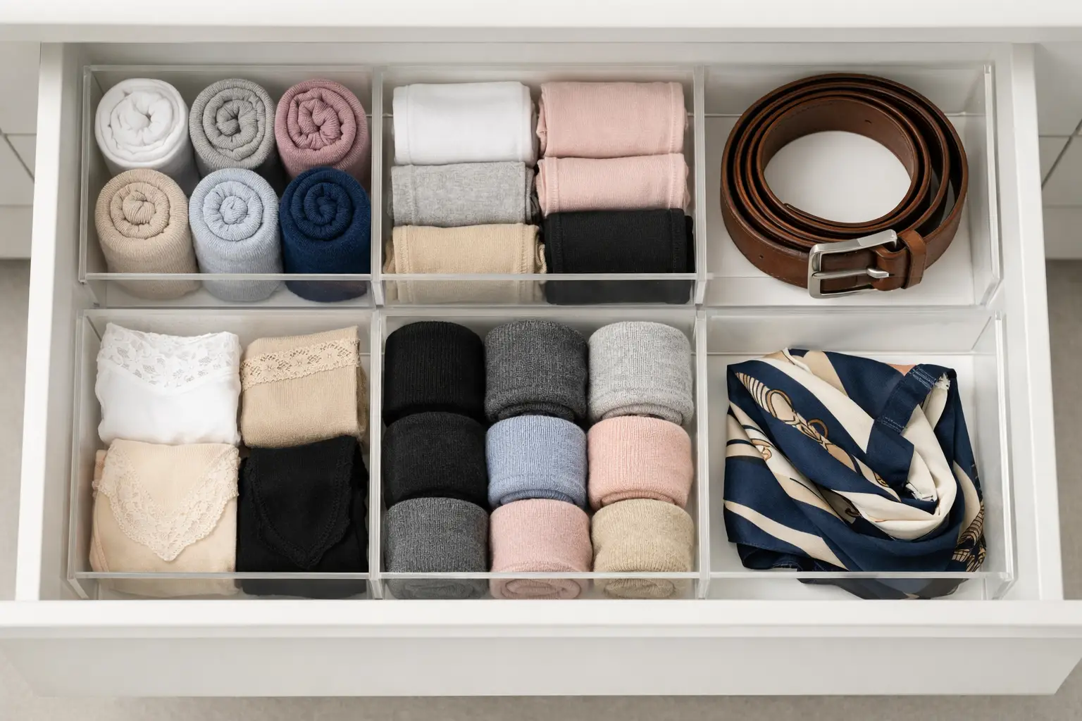Socks, belts, undergarments, and scarves disappear into drawers without dividers. Small compartments inside drawers give every item a fixed home. For smaller items such as belts, socks, or scarves, allocate individual bins or drawers that prevent misplacements or tangles.
