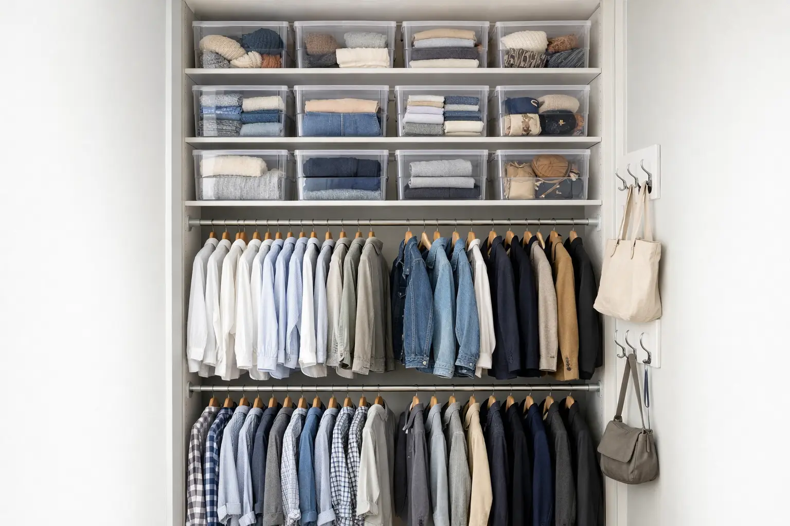 Most closets waste the top third of their space entirely. Add a second hanging rod for shorter items like shirts and jackets. Stack clear bins on upper shelves for seasonal items. Every inch of vertical space you claim back is space that relieves morning pressure.
