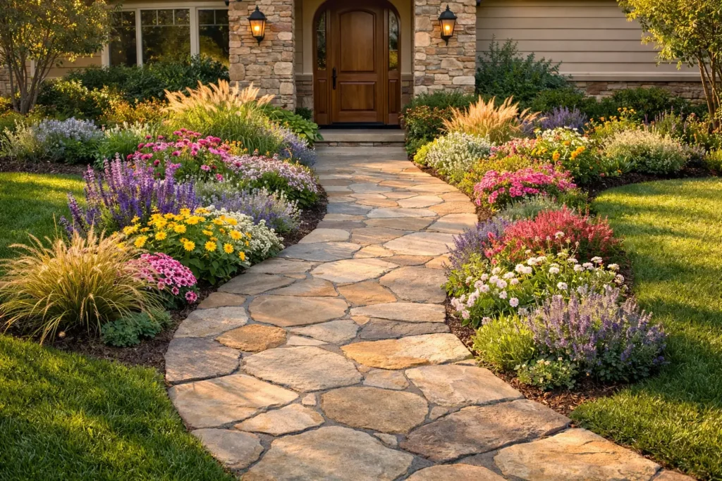 Your pathway to the front door sets the tone for the entire property. A well-designed walkway in flagstone, brick, or concrete pavers not only guides visitors safely but also anchors your landscaping design. Curved walkways feel more natural and relaxed, while straight paths convey a clean, modern look. Line the edges with low-growing flowering plants or ornamental grasses to soften the hardscape and add seasonal color throughout the year.