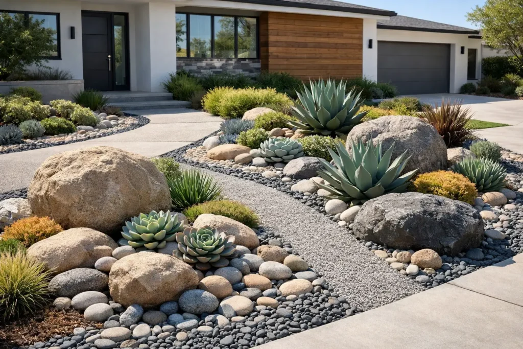 Rock gardens and gravel beds are an excellent low-maintenance alternative to traditional lawns, especially in hot or dry climates. A combination of decorative boulders, river rocks, and drought-tolerant plants like succulents and agave creates a striking, modern aesthetic that requires almost no watering or mowing. This style works particularly well with contemporary and Southwestern-style homes.