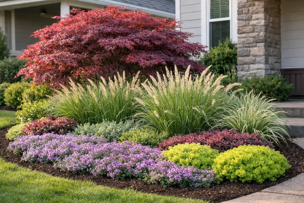 One of the hallmarks of a professionally designed landscape is layering. This means placing taller plants like ornamental trees or large shrubs toward the back or sides of a bed, mid-height plants in the middle, and low-growing ground covers or border plants in the front. This approach creates visual depth and ensures that every plant has room to shine. Japanese maples, ornamental grasses, and creeping thyme are popular choices for creating this kind of layered, lush effect.