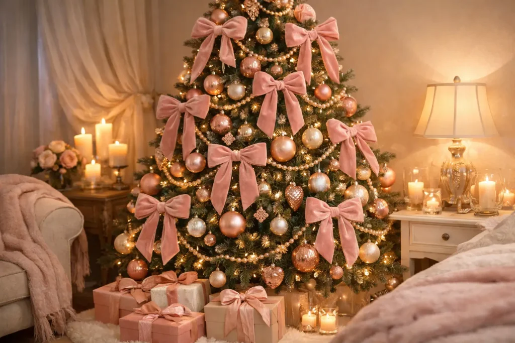 Blush pink velvet is a wonderful choice for anyone who wants to create a soft, romantic atmosphere. Pair blush pink velvet bows and ribbons with rose gold ornaments and pearl-toned baubles for a tree that feels delicate and modern at the same time. This look works beautifully in bedrooms or sitting rooms where a gentler holiday mood is desired.