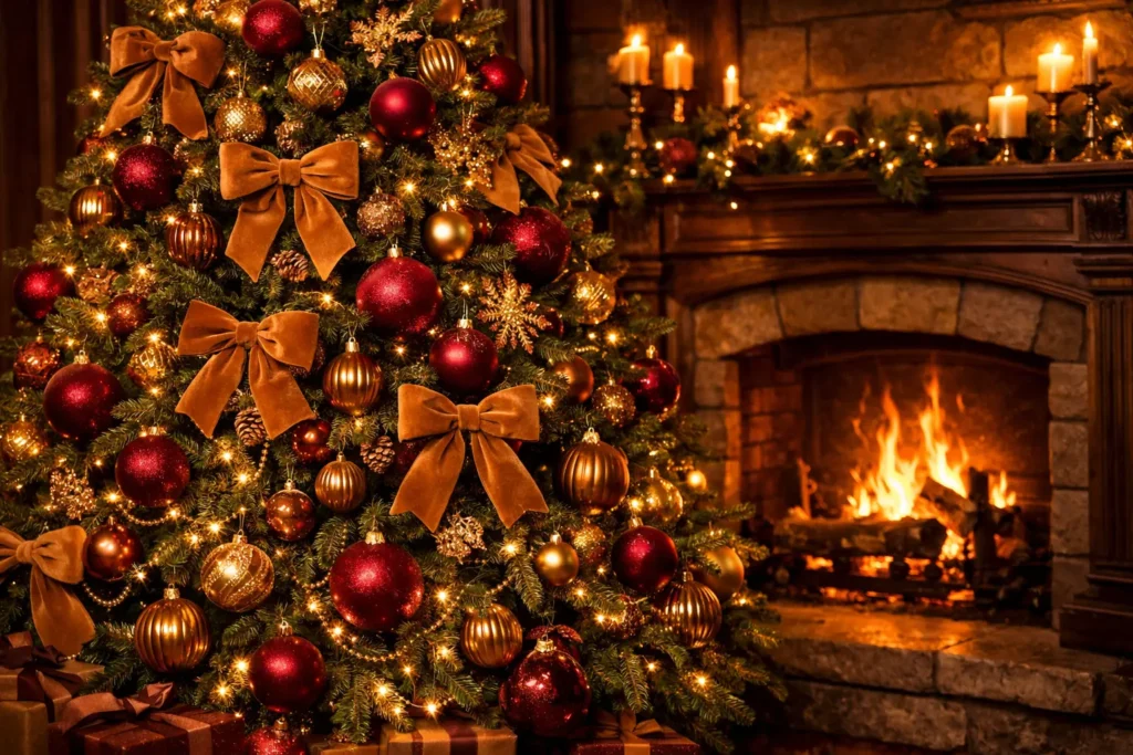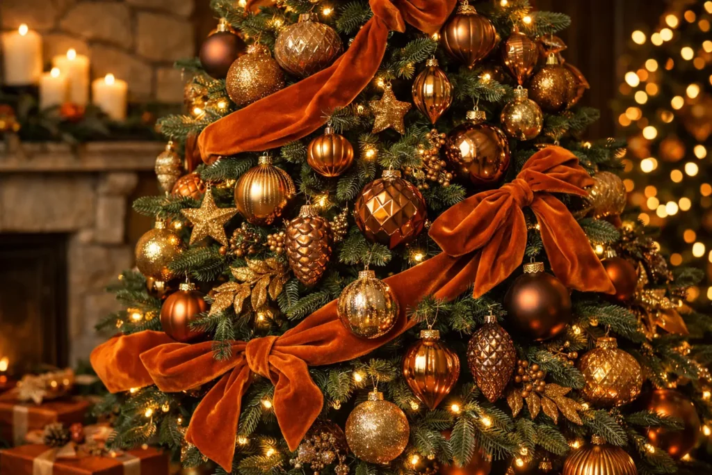 The combination of burgundy and caramel is deeply rich and endlessly satisfying to look at. Layer burgundy velvet ornaments alongside caramel-toned bows and accents, and finish with gold or bronze metallic touches. This palette evokes the feeling of a warm fireside in winter and gives your tree a layered, thoughtful quality.