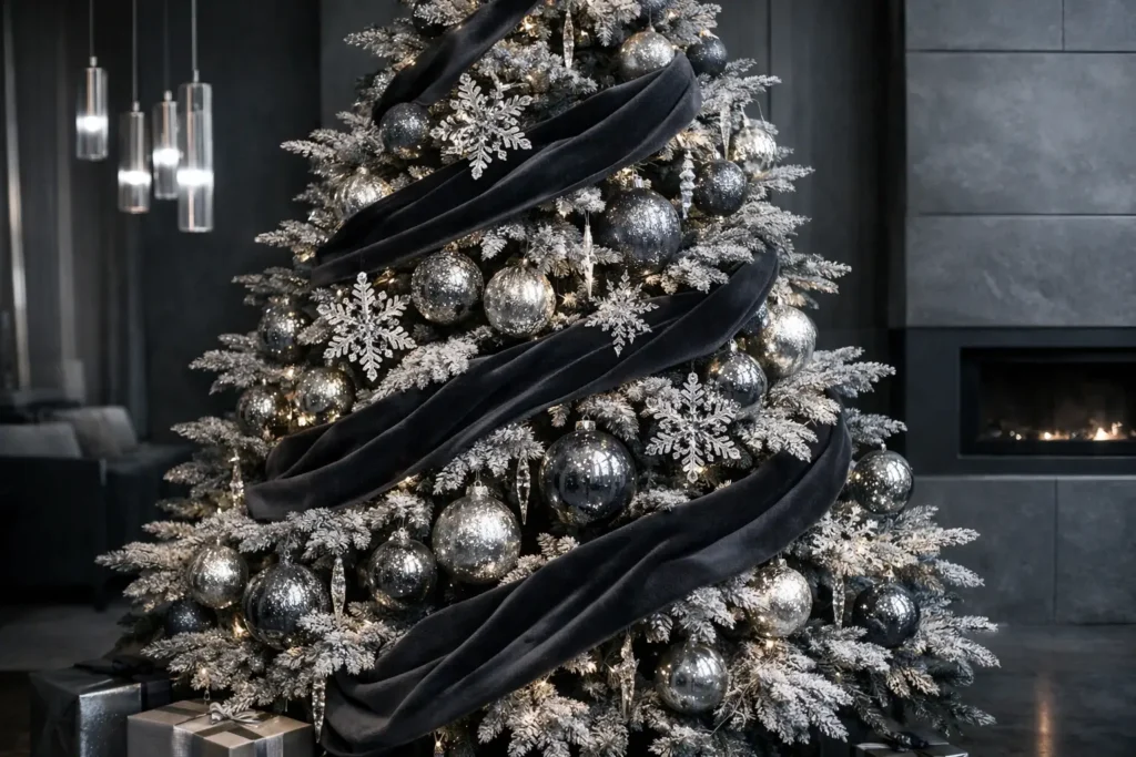For a genuinely modern take on velvet Christmas decor, consider charcoal or slate gray velvet ribbon woven through frosted silver or white tree branches. Add mercury glass ornaments and crystal snowflake accents for a sophisticated, almost architectural look that feels fresh and unexpected without sacrificing warmth.