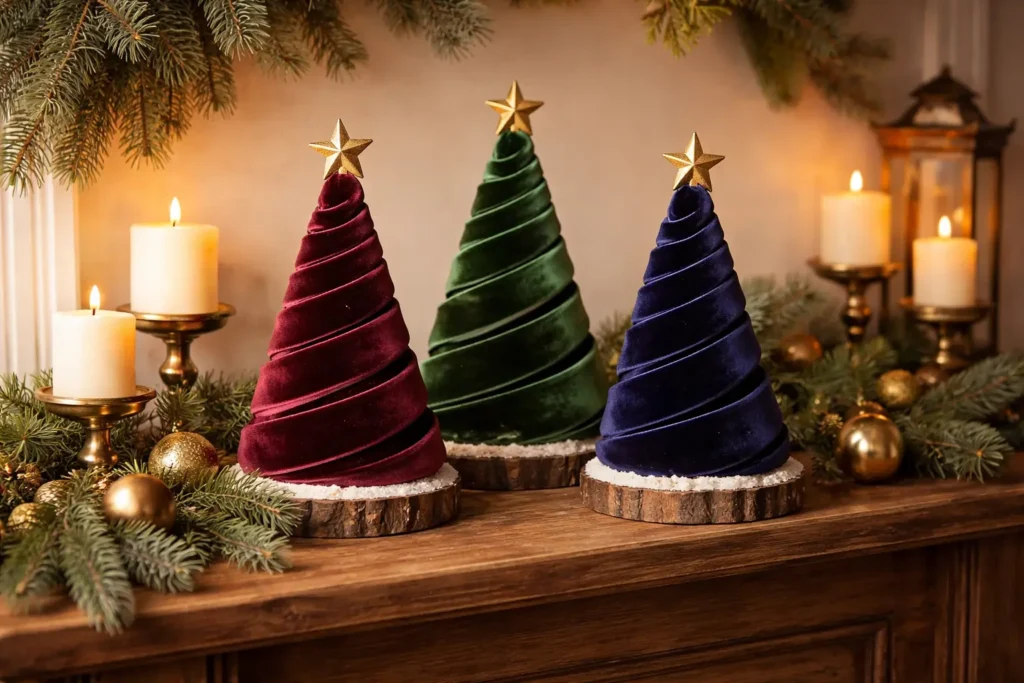 Velvet is not limited to large, full-size trees. DIY tabletop velvet trees made from paper cones wrapped in velvet ribbon are a popular and charming addition to mantels, side tables, and shelves. These small decorative trees require only a paper cone, a glue gun, and velvet ribbon, making them one of the most accessible ways to bring the velvet trend into your home without a significant investment.