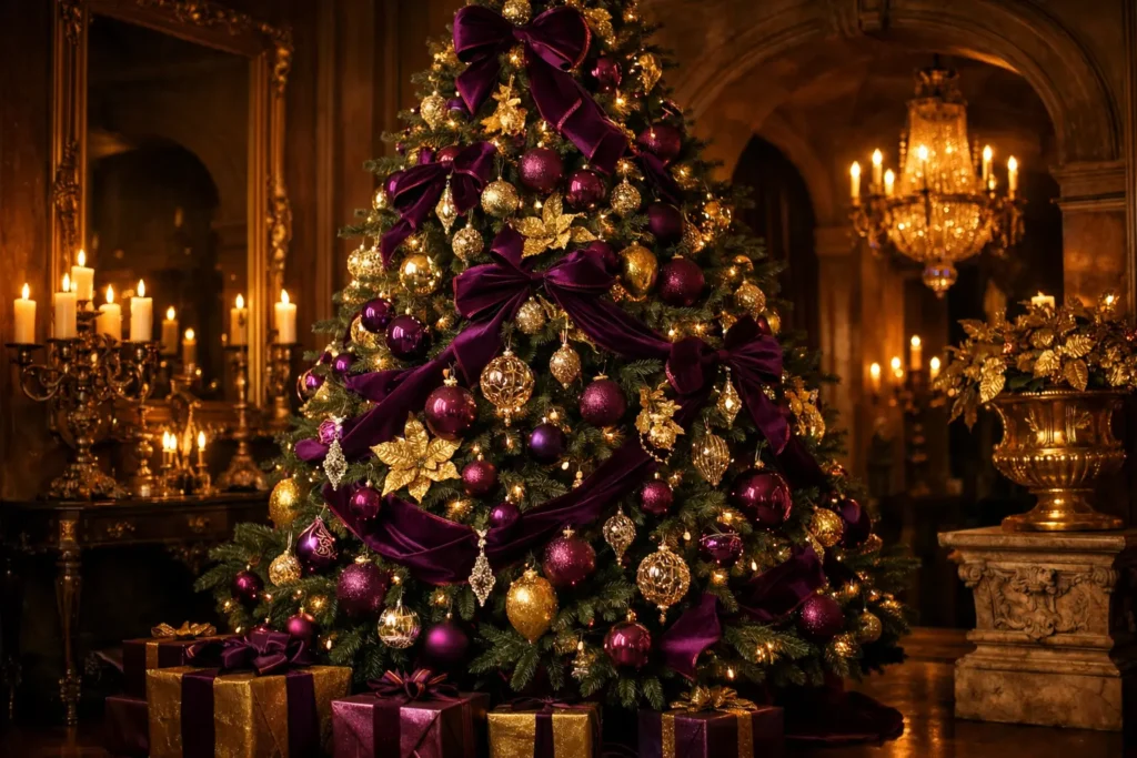 Deep plum or purple velvet brings a sense of old-world glamour and mystery to a Christmas tree. This shade works exceptionally well with gold accents and crystal ornaments, creating a look that feels theatrical and grand. It is a particularly good choice for a formal dining room or entryway where you want to make a memorable first impression.