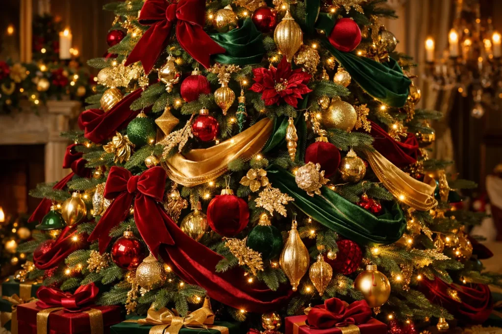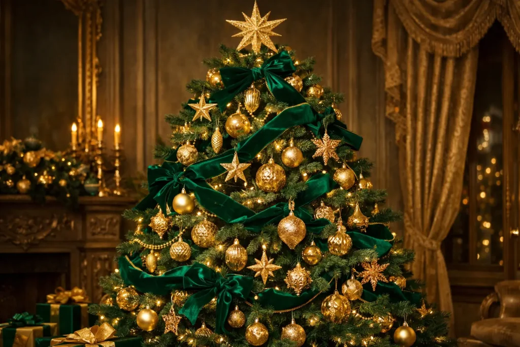 Emerald green velvet paired with gold ornaments is one of the most timeless combinations in holiday decorating. Wrap green velvet ribbon through a classic green tree and let gold baubles and metallic stars do the rest of the work. The result is a tree that feels both regal and warmly festive, like something you might find in a beautifully decorated manor house during the holidays.