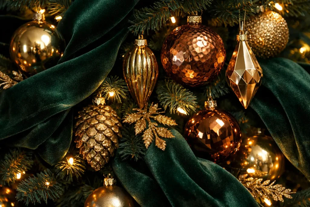 One of the most effective design strategies when decorating with velvet is combining it with metallic elements. The softness of velvet and the reflectivity of gold, silver, or copper create a beautiful tension that keeps the eye moving around the tree. Place metallic ornaments near your lights so they can pick up and reflect the glow, and use velvet pieces in the deeper, shadowed areas of the tree to create contrast and depth.
