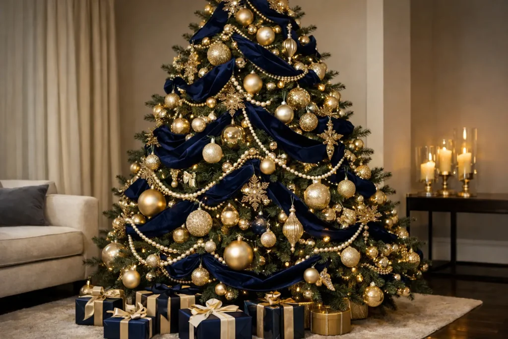 For those who want something less traditional, navy velvet ribbon combined with champagne gold ornaments creates a truly striking and sophisticated look. This pairing works particularly well in modern homes with neutral color schemes, as the deep navy brings a bold contrast while the champagne tones keep the overall mood warm and inviting.