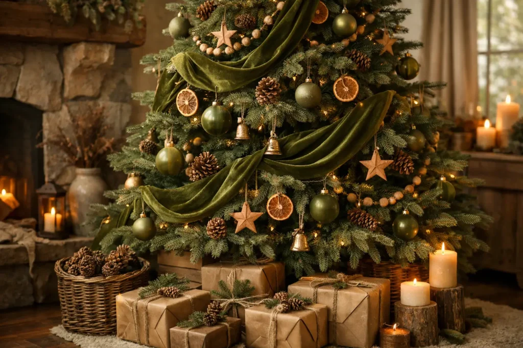 Olive green velvet is a wonderful alternative to traditional Christmas green and works particularly well in homes with a natural, earthy design sensibility. Pair olive velvet ribbon and ornaments with wooden accents, dried citrus slices, and pinecones for a tree that feels grounded, organic, and quietly luxurious all at once.