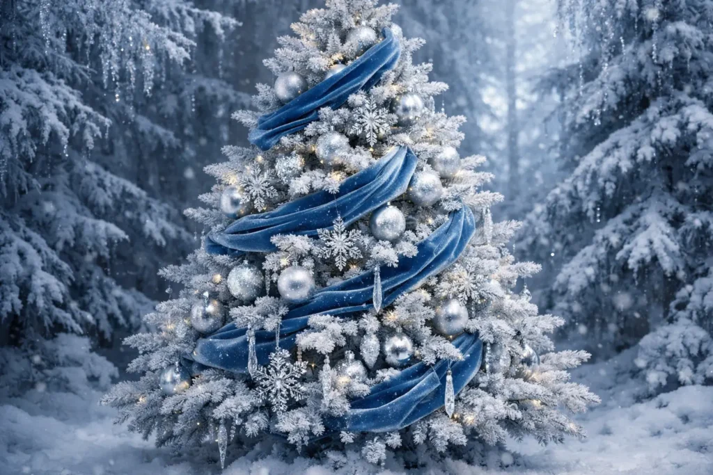 If you prefer a cooler, more wintry atmosphere, silver and blue velvet is the answer. Use icy blue velvet ribbon alongside silver ornaments and frosted white accents to create a tree that feels like it belongs in an enchanted winter forest. This look is especially effective on flocked or frosted artificial trees where the snowy effect amplifies the frosty mood.