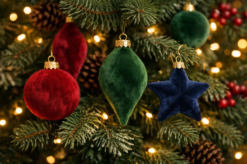 Yes, velvet ornaments pair perfectly with shiny decorations. The matte texture balances reflective surfaces. Mixing both creates a layered look. This makes the tree feel professionally styled.