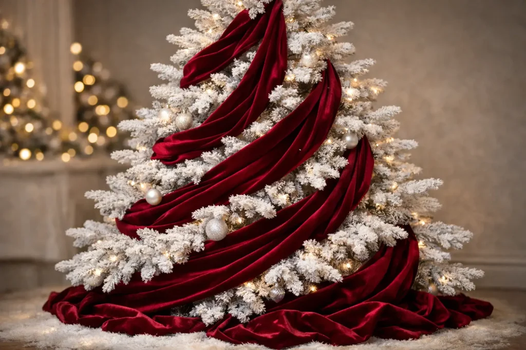 A white flocked tree provides a clean, snowy canvas that makes every color of velvet pop beautifully. Try deep cranberry or forest green velvet ribbon cascading from top to bottom against the white branches for a contrast that is both striking and refined. The texture of the velvet against the frosted branches creates a richness that is hard to achieve with any other combination.