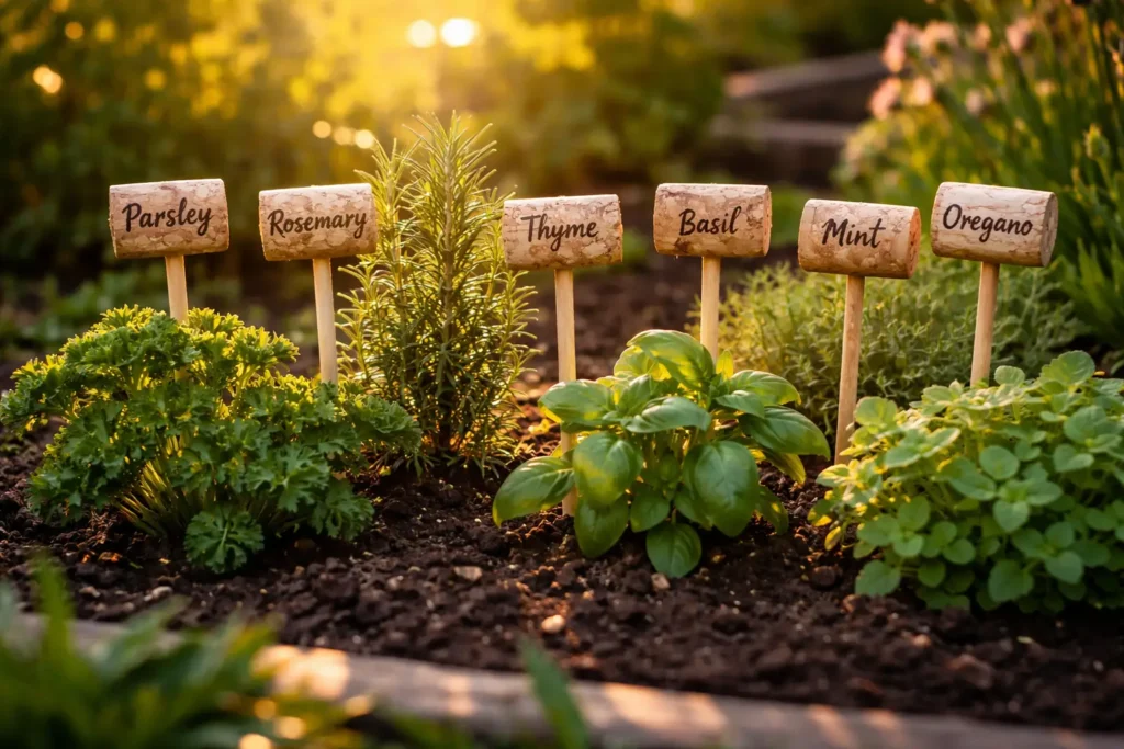 Insert a wooden skewer or popsicle stick into the bottom of a wine cork and write the name of each plant or herb directly on the cork using a permanent marker or paint. These garden markers are charming, weather-resistant, and endlessly useful for keeping your herb garden or vegetable patch organized through the growing season.