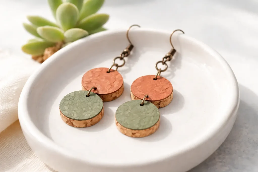 Slice thin rounds from a wine cork and attach them to earring findings or pendant bails using strong craft adhesive. Cork is lightweight enough to wear comfortably all day, and you can paint or engrave the surface to add designs. Handmade cork jewelry has a natural, earthy appeal that is genuinely stylish.