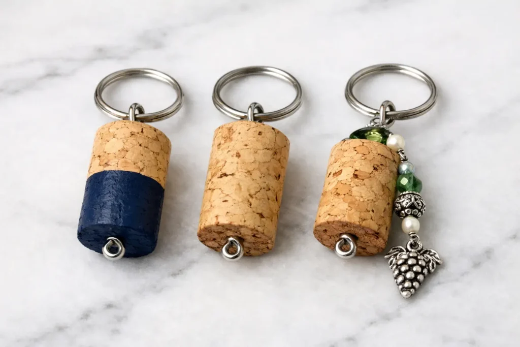 Screw a small eye hook into the end of a wine cork, thread a keyring through it, and your keychain is ready. Because cork floats in water, this is an especially smart idea for pool or boat keys. You can personalize them with paint, stamps, or decorative beads for a unique finishing touch.