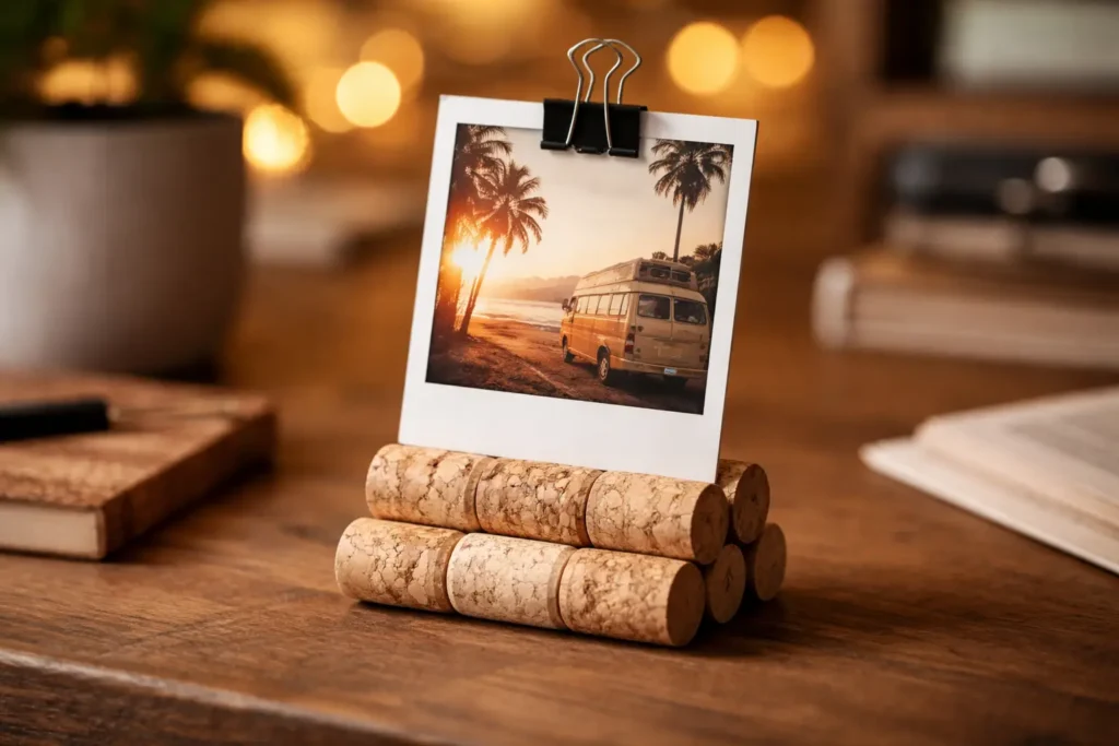 Stack and glue a small group of wine corks together to form a rectangular base. Press a thumbtack or binder clip into the top cork and slide in a photo or note card. These little photo holders are charming on desks, shelves, and windowsills and make wonderful handmade gifts.