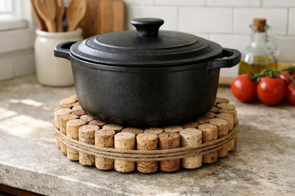 This is one of the quickest wine cork crafts on this list. Arrange corks in rows or circular patterns, wrap the entire bundle tightly with twine or a zip tie, and you have a heat-resistant trivet perfect for protecting your countertops from hot pots and pans. It works just as well as a store-bought version and looks far more interesting.
